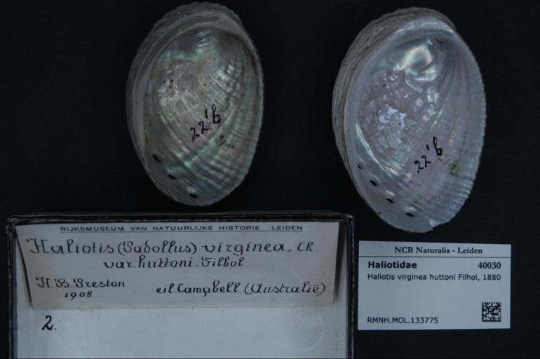 | Keywords: Naturalis Biodiversity Center - RMNH.MOL.133775 - Haliotis virginea huttoni Filhol, 1880 - Haliotidae - Mollusc shell.jpeg artwork Dimensions artwork Document type Haliotidae Haliotis Individual count Infraspecific epithet Infraspecific rank Institution Naturalis Kind of unit artwork Kind of unit specimen shell Life stage Medium artwork Nomenclatural code Source institute Leiden Scale the width of the text on the species/QR-code label is 38 mm Occurrence ID page Other fields Other versions artwork Permission license Naturalis donation CC-0 Mollusca Publication location Scientific name Haliotis virginea huttoni Filhol 1880 Scientific name authorship Filhol 1880 Source url http //bioportal naturalis nl Specific epithet virginea huttoni State or province Subject keywords artwork Subject keywords publication Title artwork Title publication Type status Uploaded with GWToolset Naturalis_Biodiversity_Center_-_RMNH MOL 133775_-_Haliotis_virginea_huttoni_Filhol _1880_-_Haliotidae_-_Mollusc_shell http //medialib naturalis nl/file/id/RMNH MOL 133775/format/large Molluscs at Naturalis from the Rijksmuseum van Natuurlijke Historie Media donated by Naturalis Biodiversity Center Haliotis Haliotis virginea huttoni |