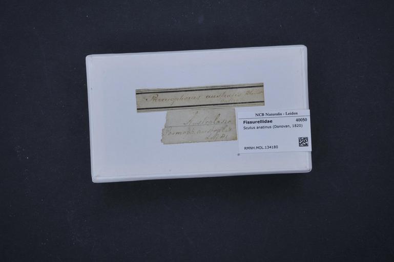 | Keywords: Naturalis Biodiversity Center - RMNH.MOL.134180 1 - Scutus anatinus (Donovan, 1820) - Fissurellidae - Mollusc shell.jpeg artwork Dimensions artwork Document type Fissurellidae subfamily Emarginulinae Scutus Individual count Infraspecific epithet Infraspecific rank Institution Naturalis Kind of unit artwork Kind of unit specimen shell Life stage Medium artwork Nomenclatural code Source institute Leiden Scale the width of the text on the species/QR-code label is 38 mm Occurrence ID page Other fields Other versions artwork Permission license Naturalis donation CC-0 Mollusca Publication location Scientific name Scutus anatinus Donovan 1820 Scientific name authorship Donovan 1820 Source url http //bioportal naturalis nl Specific epithet anatinus State or province Subject keywords artwork Subject keywords publication Title artwork Title publication Type status Uploaded with GWToolset Naturalis_Biodiversity_Center_-_RMNH MOL 134180_1_-_Scutus_anatinus_ Donovan _1820 _-_Fissurellidae_-_Mollusc_shell http //medialib naturalis nl/file/id/RMNH MOL 134180_1/format/large Molluscs at Naturalis from the Rijksmuseum van Natuurlijke Historie Media donated by Naturalis Biodiversity Center Scutus Scutus anatinus |