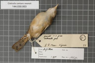 | Keywords: Naturalis Biodiversity Center - RMNH.AVES.76677 2 - Cisticola cantans swanzii (Sharpe, 1870) - Sylviidae - bird skin specimen.jpeg artwork Dimensions artwork Document type Sylviidae Cisticola Individual count 1 Infraspecific epithet swanzii Infraspecific rank Institution Naturalis Kind of unit artwork Kind of unit specimen skin Life stage Nigeria Bacita Medium artwork Nomenclatural code Occurrence ID page Other fields Other versions artwork Permission license Naturalis donation CC-0 Publication location Scientific name Cisticola cantans swanzii Sharpe 1870 Scientific name authorship Sharpe 1870 male Source url http //bioportal naturalis nl Specific epithet cantans State or province Subject keywords artwork Subject keywords publication Title artwork Title publication Type status Uploaded with GWToolset Naturalis_Biodiversity_Center_-_RMNH AVES 76677_2_-_Cisticola_cantans_swanzii_ Sharpe _1870 _-_Sylviidae_-_bird_skin_specimen http //medialib naturalis nl/file/id/RMNH AVES 76677_2/format/large Media donated by Naturalis Biodiversity Center Songbird specimens at Naturalis Biodiversity Center Cisticola cantans museum specimens |
