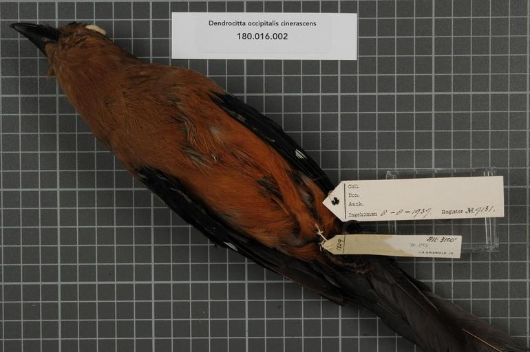 | Keywords: Naturalis Biodiversity Center - RMNH.AVES.9131 2 - Dendrocitta occipitalis cinerascens Sharpe, 1879 - Corvidae - bird skin specimen.jpeg artwork Dimensions artwork Document type Corvidae Dendrocitta Individual count 1 Infraspecific epithet cinerascens Infraspecific rank Institution Naturalis Kind of unit artwork Kind of unit specimen skin Life stage Indonesia Borneo Mt Kinabalu Kiau Medium artwork Nomenclatural code ADDITIONAL info BN ADDITIONAL info remark probably North Borneo Occurrence ID page Other fields Other versions artwork Permission license Naturalis donation CC-0 Publication location Scientific name Dendrocitta occipitalis cinerascens Sharpe 1879 Scientific name authorship Sharpe 1879 male Source url http //bioportal naturalis nl Specific epithet occipitalis State or province Subject keywords artwork Subject keywords publication Title artwork Title publication Type status Uploaded with GWToolset Naturalis_Biodiversity_Center_-_RMNH AVES 9131_2_-_Dendrocitta_occipitalis_cinerascens_Sharpe _1879_-_Corvidae_-_bird_skin_specimen http //medialib naturalis nl/file/id/RMNH AVES 9131_2/format/large Media donated by Naturalis Biodiversity Center Songbird specimens at Naturalis Biodiversity Center Dendrocitta cinerascens museum specimens |
