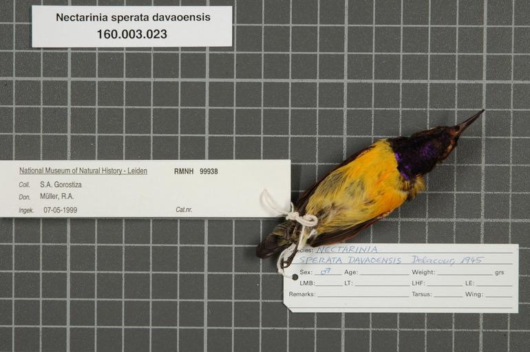 | Keywords: Naturalis Biodiversity Center - RMNH.AVES.99938 2 - Nectarinia sperata davaoensis Delacour, 1945 - Nectariniidae - bird skin specimen.jpeg artwork Dimensions artwork Document type Nectariniidae Nectarinia Individual count 1 Infraspecific epithet davaoensis Infraspecific rank Institution Naturalis Kind of unit artwork Kind of unit specimen skin Life stage Philippines Mindanao Isl Davao del Sur Talagutong Malita Medium artwork Nomenclatural code Occurrence ID page Other fields Other versions artwork Permission license Naturalis donation CC-0 Publication location Scientific name Nectarinia sperata davaoensis Delacour 1945 Scientific name authorship Delacour 1945 male Source url http //bioportal naturalis nl Specific epithet sperata State or province Subject keywords artwork Subject keywords publication Title artwork Title publication Type status Uploaded with GWToolset Naturalis_Biodiversity_Center_-_RMNH AVES 99938_2_-_Nectarinia_sperata_davaoensis_Delacour _1945_-_Nectariniidae_-_bird_skin_specimen http //medialib naturalis nl/file/id/RMNH AVES 99938_2/format/large Media donated by Naturalis Biodiversity Center Songbird specimens at Naturalis Biodiversity Center Leptocoma sperata |