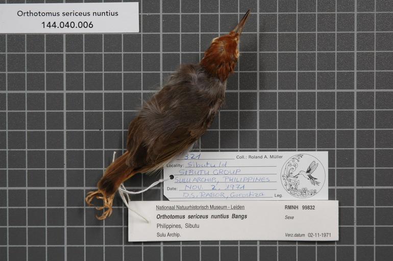 | Keywords: Naturalis Biodiversity Center - RMNH.AVES.99832 1 - Orthotomus sericeus nuntius Bangs, 1922 - Sylviidae - bird skin specimen.jpeg artwork Dimensions artwork Document type Sylviidae Orthotomus Individual count 1 Infraspecific epithet nuntius Infraspecific rank Institution Naturalis Kind of unit artwork Kind of unit specimen skin Life stage Philippines Sulu Archip Sibutu group Sibutu Id Medium artwork Nomenclatural code Occurrence ID page Other fields Other versions artwork Permission license Naturalis donation CC-0 Publication location Scientific name Orthotomus sericeus nuntius Bangs 1922 Scientific name authorship Bangs 1922 Source url http //bioportal naturalis nl Specific epithet sericeus State or province Subject keywords artwork Subject keywords publication Title artwork Title publication Type status Uploaded with GWToolset Naturalis_Biodiversity_Center_-_RMNH AVES 99832_1_-_Orthotomus_sericeus_nuntius_Bangs _1922_-_Sylviidae_-_bird_skin_specimen http //medialib naturalis nl/file/id/RMNH AVES 99832_1/format/large Media donated by Naturalis Biodiversity Center Songbird specimens at Naturalis Biodiversity Center Orthotomus sericeus |