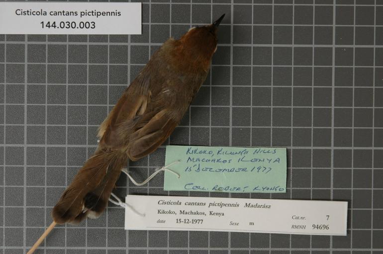 | Keywords: Naturalis Biodiversity Center - RMNH.AVES.94696 1 - Cisticola cantans pictipennis Madarász, 1904 - Sylviidae - bird skin specimen.jpeg artwork Dimensions artwork Document type Sylviidae Cisticola Individual count 1 Infraspecific epithet pictipennis Infraspecific rank Institution Naturalis Kind of unit artwork Kind of unit specimen skin Life stage Kenya Machakos Kilungu Hills Kikoko Medium artwork Nomenclatural code Occurrence ID page Other fields Other versions artwork Permission license Naturalis donation CC-0 Publication location Scientific name Cisticola cantans pictipennis Madarász 1904 Scientific name authorship Madarász 1904 male Source url http //bioportal naturalis nl Specific epithet cantans State or province Machakos Kilungu Hills Subject keywords artwork Subject keywords publication Title artwork Title publication Type status Uploaded with GWToolset Naturalis_Biodiversity_Center_-_RMNH AVES 94696_1_-_Cisticola_cantans_pictipennis_Madarász _1904_-_Sylviidae_-_bird_skin_specimen http //medialib naturalis nl/file/id/RMNH AVES 94696_1/format/large Media donated by Naturalis Biodiversity Center Songbird specimens at Naturalis Biodiversity Center Cisticola cantans museum specimens |