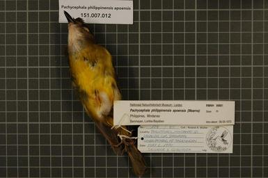 View Original:Naturalis Biodiversity Center - RMNH.AVES.99881 2 - Pachycephala philippinensis apoensis (Mearns, 1905) - Pachycephalidae - bird skin specimen.jpeg.jpg (1920x1277)