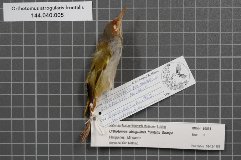Keywords: Naturalis Biodiversity Center - RMNH.AVES.99834 1 - Orthotomus atrogularis frontalis Sharpe, 1877 - Sylviidae - bird skin specimen.jpeg artwork Dimensions artwork Document type Sylviidae Orthotomus Individual count 1 Infraspecific epithet frontalis Infraspecific rank Institution Naturalis Kind of unit artwork Kind of unit specimen skin Life stage Philippines Mindanao Isl Davao del Sur Malalag Medium artwork Nomenclatural code Occurrence ID page Other fields Other versions artwork Permission license Naturalis donation CC-0 Publication location Scientific name Orthotomus atrogularis frontalis Sharpe 1877 Scientific name authorship Sharpe 1877 male Source url http //bioportal naturalis nl Specific epithet atrogularis State or province Subject keywords artwork Subject keywords publication Title artwork Title publication Type status Uploaded with GWToolset Naturalis_Biodiversity_Center_-_RMNH AVES 99834_1_-_Orthotomus_atrogularis_frontalis_Sharpe _1877_-_Sylviidae_-_bird_skin_specimen http //medialib naturalis nl/file/id/RMNH AVES 99834_1/format/large Media donated by Naturalis Biodiversity Center Songbird specimens at Naturalis Biodiversity Center Orthotomus atrogularis