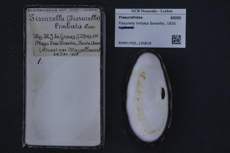 | Keywords: Naturalis Biodiversity Center - RMNH.MOL.134819 - Fissurella limbata Sowerby, 1835 - Fissurellidae - Mollusc shell.jpeg artwork Dimensions artwork Document type Fissurellidae subfamily Fissurellinae Fissurella Individual count Infraspecific epithet Infraspecific rank Institution Naturalis Kind of unit artwork Kind of unit specimen shell Life stage Medium artwork Nomenclatural code Source institute Leiden Scale the width of the text on the species/QR-code label is 38 mm Occurrence ID page Other fields Other versions artwork Permission license Naturalis donation CC-0 Mollusca Publication location Scientific name Fissurella limbata Sowerby 1835 Scientific name authorship Sowerby 1835 Source url http //bioportal naturalis nl Specific epithet limbata State or province Subject keywords artwork Subject keywords publication Title artwork Title publication Type status possible syntype Uploaded with GWToolset Naturalis_Biodiversity_Center_-_RMNH MOL 134819_-_Fissurella_limbata_Sowerby _1835_-_Fissurellidae_-_Mollusc_shell http //medialib naturalis nl/file/id/RMNH MOL 134819/format/large Molluscs at Naturalis from the Rijksmuseum van Natuurlijke Historie Media donated by Naturalis Biodiversity Center Fissurella limbata |