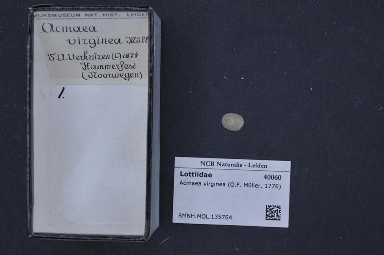 | Keywords: Naturalis Biodiversity Center - RMNH.MOL.135764 - Tectura virginea (Müller, 1776) - Lottiidae - Mollusc shell.jpeg artwork Dimensions artwork Document type Lottiidae Tectura Individual count Infraspecific epithet Infraspecific rank Institution Naturalis Kind of unit artwork Kind of unit specimen shell Life stage Medium artwork Nomenclatural code Source institute Leiden Scale the width of the text on the species/QR-code label is 38 mm Occurrence ID page Other fields Other versions artwork Permission license Naturalis donation CC-0 Mollusca Publication location Scientific name Tectura virginea Müller 1776 Scientific name authorship Müller 1776 Source url http //bioportal naturalis nl Specific epithet virginea State or province Subject keywords artwork Subject keywords publication Title artwork Title publication Type status Uploaded with GWToolset Naturalis_Biodiversity_Center_-_RMNH MOL 135764_-_Tectura_virginea_ Müller _1776 _-_Lottiidae_-_Mollusc_shell http //medialib naturalis nl/file/id/RMNH MOL 135764/format/large Molluscs at Naturalis from the Rijksmuseum van Natuurlijke Historie Media donated by Naturalis Biodiversity Center Tectura virginea |