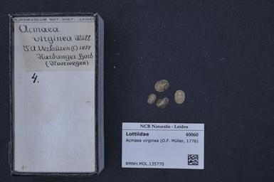 | Keywords: Naturalis Biodiversity Center - RMNH.MOL.135770 - Tectura virginea (Müller, 1776) - Lottiidae - Mollusc shell.jpeg artwork Dimensions artwork Document type Lottiidae Tectura Individual count Infraspecific epithet Infraspecific rank Institution Naturalis Kind of unit artwork Kind of unit specimen shell Life stage Medium artwork Nomenclatural code Source institute Leiden Scale the width of the text on the species/QR-code label is 38 mm Occurrence ID page Other fields Other versions artwork Permission license Naturalis donation CC-0 Mollusca Publication location Scientific name Tectura virginea Müller 1776 Scientific name authorship Müller 1776 Source url http //bioportal naturalis nl Specific epithet virginea State or province Subject keywords artwork Subject keywords publication Title artwork Title publication Type status Uploaded with GWToolset Naturalis_Biodiversity_Center_-_RMNH MOL 135770_-_Tectura_virginea_ Müller _1776 _-_Lottiidae_-_Mollusc_shell http //medialib naturalis nl/file/id/RMNH MOL 135770/format/large Molluscs at Naturalis from the Rijksmuseum van Natuurlijke Historie Media donated by Naturalis Biodiversity Center Tectura virginea |