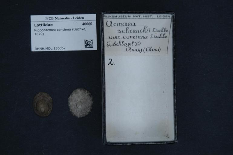 | Keywords: Naturalis Biodiversity Center - RMNH.MOL.136062 - Nipponacmea concinna (Lischke, 1870) - Lottiidae - Mollusc shell.jpeg artwork Dimensions artwork Document type Lottiidae Nipponacmea Individual count Infraspecific epithet Infraspecific rank Institution Naturalis Kind of unit artwork Kind of unit specimen shell Life stage Medium artwork Nomenclatural code Source institute Leiden Scale the width of the text on the species/QR-code label is 38 mm Occurrence ID page Other fields Other versions artwork Permission license Naturalis donation CC-0 Mollusca Publication location Scientific name Nipponacmea concinna Lischke 1870 Scientific name authorship Lischke 1870 Source url http //bioportal naturalis nl Specific epithet concinna State or province Subject keywords artwork Subject keywords publication Title artwork Title publication Type status Uploaded with GWToolset Naturalis_Biodiversity_Center_-_RMNH MOL 136062_-_Nipponacmea_concinna_ Lischke _1870 _-_Lottiidae_-_Mollusc_shell http //medialib naturalis nl/file/id/RMNH MOL 136062/format/large Molluscs at Naturalis from the Rijksmuseum van Natuurlijke Historie Media donated by Naturalis Biodiversity Center Nipponacmea Nipponacmea concinna |