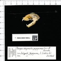 Keywords: Naturalis Biodiversity Center - RMNH.MAM.19860.a lat - Pteropus dasymallus yayeyamae - skull.jpeg artwork Dimensions artwork Document type Pteropus Individual count 1 Infraspecific epithet yayeyamae Infraspecific rank Institution Naturalis Kind of unit artwork Kind of unit specimen skull Life stage Ishigaki Yayeyama S Liukiu Isl Z O Aziƫ Medium artwork Nomenclatural code Occurrence ID page Other fields Other versions artwork Permission license Naturalis donation CC-0 Publication location Scientific name Pteropus dasymallus yayeyamae Scientific name authorship male Source url http //bioportal naturalis nl Specific epithet dasymallus State or province Subject keywords artwork Subject keywords publication Title artwork Title publication Type status Uploaded with GWToolset Naturalis_Biodiversity_Center_-_RMNH MAM 19860 a_lat_-_Pteropus_dasymallus_yayeyamae_-_skull http //medialib naturalis nl/file/id/RMNH MAM 19860 a_lat/format/large Media donated by Naturalis Biodiversity Center Mammals at Naturalis from the Rijksmuseum van Natuurlijke Historie Pteropus dasymallus Pteropus |