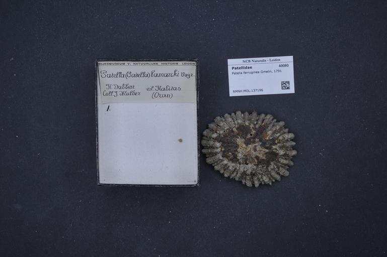 Keywords: Naturalis Biodiversity Center - RMNH.MOL.137196 - Patella ferruginea Gmelin, 1791 - Patellidae - Mollusc shell.jpeg artwork Dimensions artwork Document type Patellidae subfamily Patellinae Patella Individual count Infraspecific epithet Infraspecific rank Institution Naturalis Kind of unit artwork Kind of unit specimen shell Life stage Medium artwork Nomenclatural code Source institute Leiden Scale the width of the text on the species/QR-code label is 38 mm Occurrence ID page Other fields Other versions artwork Permission license Naturalis donation CC-0 Mollusca Publication location Scientific name Patella ferruginea Gmelin 1791 Scientific name authorship Gmelin 1791 Source url http //bioportal naturalis nl Specific epithet ferruginea State or province Subject keywords artwork Subject keywords publication Title artwork Title publication Type status Uploaded with GWToolset Naturalis_Biodiversity_Center_-_RMNH MOL 137196_-_Patella_ferruginea_Gmelin _1791_-_Patellidae_-_Mollusc_shell http //medialib naturalis nl/file/id/RMNH MOL 137196/format/large Molluscs at Naturalis from the Rijksmuseum van Natuurlijke Historie Media donated by Naturalis Biodiversity Center Patella mollusc Patella ferruginea |