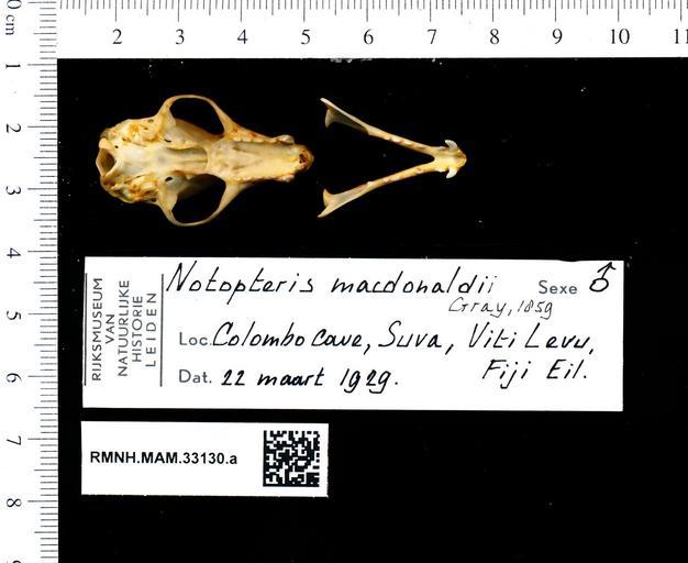 Keywords: Naturalis Biodiversity Center - RMNH.MAM.33130.a pal - Notopteris macdonaldi - skull.jpeg artwork Dimensions artwork Document type Notopteris Individual count 1 Infraspecific epithet Infraspecific rank Institution Naturalis Kind of unit artwork Kind of unit specimen skull Life stage Colombo Cave Suva Viti Levu Fiji Eil Medium artwork Nomenclatural code Occurrence ID page Other fields Other versions artwork Permission license Naturalis donation CC-0 Publication location Scientific name Notopteris macdonaldi Scientific name authorship male Source url http //bioportal naturalis nl Specific epithet macdonaldi State or province Subject keywords artwork Subject keywords publication Title artwork Title publication Type status Uploaded with GWToolset Naturalis_Biodiversity_Center_-_RMNH MAM 33130 a_pal_-_Notopteris_macdonaldi_-_skull http //medialib naturalis nl/file/id/RMNH MAM 33130 a_pal/format/large Media donated by Naturalis Biodiversity Center Mammals at Naturalis from the Rijksmuseum van Natuurlijke Historie Notopteris macdonaldi Notopteris