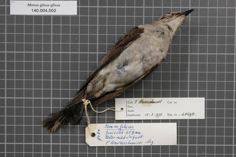 Keywords: Naturalis Biodiversity Center - RMNH.AVES.68698 2 - Mimus gilvus gilvus (Vieillot, 1808) - Mimidae - bird skin specimen.jpeg artwork Dimensions artwork Document type Mimidae Mimus Individual count 1 Infraspecific epithet gilvus Infraspecific rank Institution Naturalis Kind of unit artwork Kind of unit specimen skin Life stage Suriname Zanderij Medium artwork Nomenclatural code Occurrence ID page Other fields Other versions artwork Permission license Naturalis donation CC-0 Publication location Scientific name Mimus gilvus gilvus Vieillot 1808 Scientific name authorship Vieillot 1808 female Source url http //bioportal naturalis nl Specific epithet gilvus State or province Subject keywords artwork Subject keywords publication Title artwork Title publication Type status Uploaded with GWToolset Naturalis_Biodiversity_Center_-_RMNH AVES 68698_2_-_Mimus_gilvus_gilvus_ Vieillot _1808 _-_Mimidae_-_bird_skin_specimen http //medialib naturalis nl/file/id/RMNH AVES 68698_2/format/large Media donated by Naturalis Biodiversity Center Songbird specimens at Naturalis Biodiversity Center Mimus gilvus museum specimens |