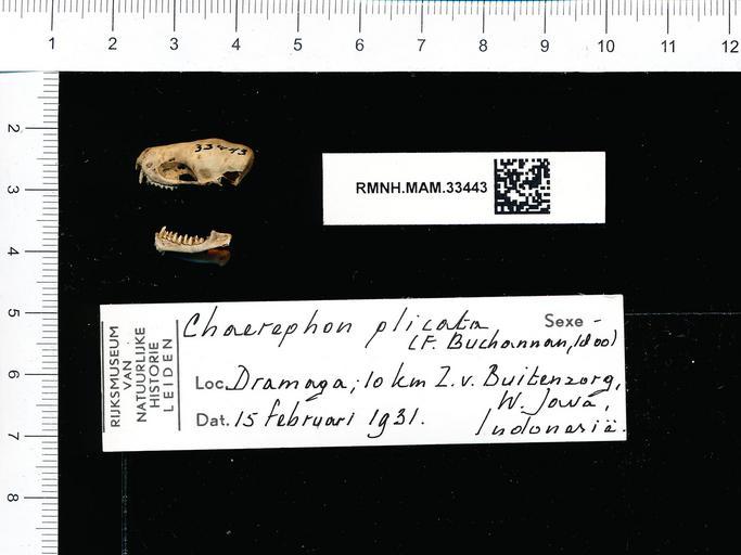 Keywords: Naturalis Biodiversity Center - RMNH.MAM.33443 lat - Chaerephon plicatus - skull.jpeg artwork Dimensions artwork Document type Chaerephon Individual count 1 Infraspecific epithet Infraspecific rank Institution Naturalis Kind of unit artwork Kind of unit specimen skull Life stage Dramaga; 10 km Z v Buitenzorg W Java Indonesia Medium artwork Nomenclatural code Occurrence ID page Other fields Other versions artwork Permission license Naturalis donation CC-0 Publication location Scientific name Chaerephon plicatus Scientific name authorship Source url http //bioportal naturalis nl Specific epithet plicatus State or province Subject keywords artwork Subject keywords publication Title artwork Title publication Type status Uploaded with GWToolset Naturalis_Biodiversity_Center_-_RMNH MAM 33443_lat_-_Chaerephon_plicatus_-_skull http //medialib naturalis nl/file/id/RMNH MAM 33443_lat/format/large Media donated by Naturalis Biodiversity Center Mammals at Naturalis from the Rijksmuseum van Natuurlijke Historie Chaerephon plicatus |
