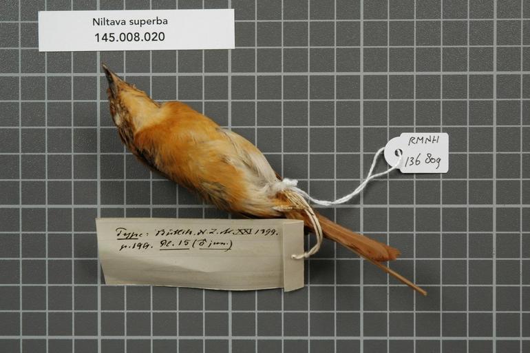 | Keywords: Naturalis Biodiversity Center - RMNH.AVES.136809 2 - Niltava superba (Stresemann, 1925) - Muscicapidae - bird skin specimen.jpeg artwork Dimensions artwork Document type Muscicapidae Niltava Individual count 1 Infraspecific epithet Infraspecific rank Institution Naturalis Kind of unit artwork Kind of unit specimen skin Life stage juvenile Indonesia C Borneo Mt Kenepai Medium artwork Nomenclatural code Check type Sex remark on label male jun lab Occurrence ID page Other fields Other versions artwork Permission license Naturalis donation CC-0 Publication location Scientific name Niltava superba Stresemann 1925 Scientific name authorship Stresemann 1925 male Source url http //bioportal naturalis nl Specific epithet superba State or province C Borneo Subject keywords artwork Subject keywords publication Title artwork Title publication Type status Uploaded with GWToolset Naturalis_Biodiversity_Center_-_RMNH AVES 136809_2_-_Niltava_superba_ Stresemann _1925 _-_Muscicapidae_-_bird_skin_specimen http //medialib naturalis nl/file/id/RMNH AVES 136809_2/format/large Media donated by Naturalis Biodiversity Center Songbird specimens at Naturalis Biodiversity Center Cyornis superbus museum specimens |