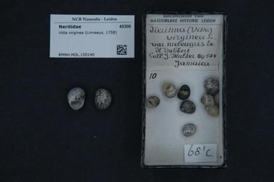 | Keywords: Naturalis Biodiversity Center - RMNH.MOL.150140 - Vitta virginea (Linnaeus, 1758) - Neritidae - Mollusc shell.jpeg artwork Dimensions artwork Document type Neritidae Vitta Individual count Infraspecific epithet Infraspecific rank Institution Naturalis Kind of unit artwork Kind of unit specimen shell Life stage Medium artwork Nomenclatural code Scale the width of the text on the species/QR-code label is 38 mm Occurrence ID page Other fields Other versions artwork Permission license Naturalis donation CC-0 Mollusca Publication location Scientific name Vitta virginea Linnaeus 1758 Scientific name authorship Linnaeus 1758 Source url http //bioportal naturalis nl Specific epithet virginea State or province Subject keywords artwork Subject keywords publication Title artwork Title publication Type status Uploaded with GWToolset Naturalis_Biodiversity_Center_-_RMNH MOL 150140_-_Vitta_virginea_ Linnaeus _1758 _-_Neritidae_-_Mollusc_shell http //medialib naturalis nl/file/id/RMNH MOL 150140/format/large Media donated by Naturalis Biodiversity Center Molluscs at Naturalis from the Rijksmuseum van Natuurlijke Historie Vitta virginea |