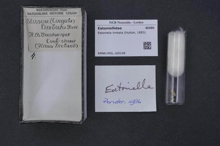 | Keywords: Naturalis Biodiversity Center - RMNH.MOL.160149 - Eatoniella limbata (Hutton, 1883) - Eatoniellidae - Mollusc shell.jpeg artwork Dimensions artwork Document type Eatoniellidae Eatoniella Individual count Infraspecific epithet Infraspecific rank Institution Naturalis Kind of unit artwork Kind of unit specimen shell Life stage Medium artwork Nomenclatural code Scale the width of the text on the species/QR-code label is 38 mm Occurrence ID page Other fields Other versions artwork Permission license Naturalis donation CC-0 Mollusca Publication location Scientific name Eatoniella limbata Hutton 1883 Scientific name authorship Hutton 1883 Source url http //bioportal naturalis nl Specific epithet limbata State or province Subject keywords artwork Subject keywords publication Title artwork Title publication Type status Uploaded with GWToolset Naturalis_Biodiversity_Center_-_RMNH MOL 160149_-_Eatoniella_limbata_ Hutton _1883 _-_Eatoniellidae_-_Mollusc_shell http //medialib naturalis nl/file/id/RMNH MOL 160149/format/large Media donated by Naturalis Biodiversity Center Molluscs at Naturalis from the Rijksmuseum van Natuurlijke Historie Eatoniella limbata Eatoniella |