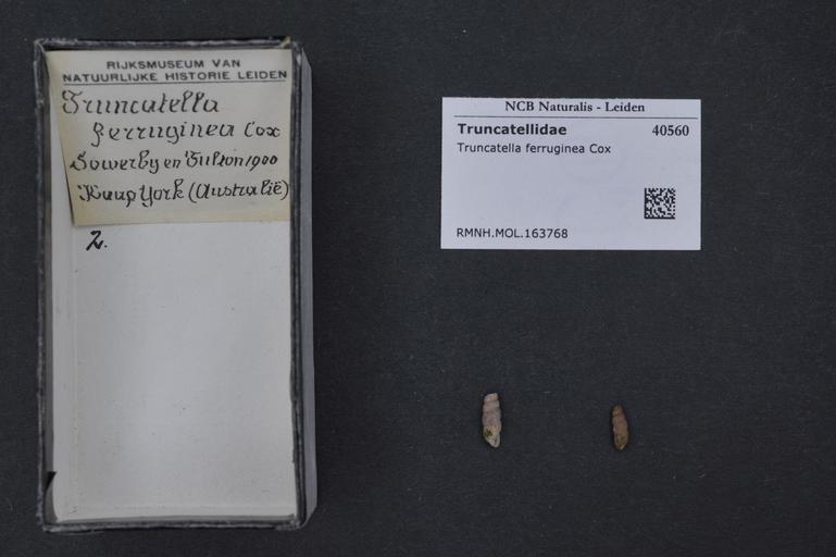 Keywords: Naturalis Biodiversity Center - RMNH.MOL.163768 - Truncatella ferruginea Cox - Truncatellidae - Mollusc shell.jpeg artwork Dimensions artwork Document type Truncatellidae Truncatella Individual count Infraspecific epithet Infraspecific rank Institution Naturalis Kind of unit artwork Kind of unit specimen shell Life stage Medium artwork Nomenclatural code Scale the width of the text on the species/QR-code label is 38 mm Occurrence ID page Other fields Other versions artwork Permission license Naturalis donation CC-0 Mollusca Publication location Scientific name Truncatella ferruginea Cox Scientific name authorship Cox Source url http //bioportal naturalis nl Specific epithet ferruginea State or province Subject keywords artwork Subject keywords publication Title artwork Title publication Type status Uploaded with GWToolset Naturalis_Biodiversity_Center_-_RMNH MOL 163768_-_Truncatella_ferruginea_Cox_-_Truncatellidae_-_Mollusc_shell http //medialib naturalis nl/file/id/RMNH MOL 163768/format/large Media donated by Naturalis Biodiversity Center Molluscs at Naturalis from the Rijksmuseum van Natuurlijke Historie Truncatella ferruginea Truncatella |