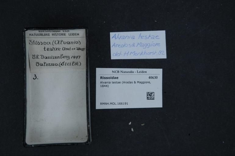 | Keywords: Naturalis Biodiversity Center - RMNH.MOL.166191 - Alvania testae (Aradas & Maggiore, 1844) - Rissoidae - Mollusc shell.jpeg artwork Dimensions artwork Document type Rissoidae subfamily Rissoinae Alvania Individual count Infraspecific epithet Infraspecific rank Institution Naturalis Kind of unit artwork Kind of unit specimen shell Life stage Medium artwork Nomenclatural code Scale the width of the text on the species/QR-code label is 38 mm Occurrence ID page Other fields Other versions artwork Permission license Naturalis donation CC-0 Mollusca Publication location Scientific name Alvania testae Aradas Maggiore 1844 Scientific name authorship Aradas Maggiore 1844 Source url http //bioportal naturalis nl Specific epithet testae State or province Subject keywords artwork Subject keywords publication Title artwork Title publication Type status Uploaded with GWToolset Naturalis_Biodiversity_Center_-_RMNH MOL 166191_-_Alvania_testae_ Aradas_ _Maggiore _1844 _-_Rissoidae_-_Mollusc_shell http //medialib naturalis nl/file/id/RMNH MOL 166191/format/large Media donated by Naturalis Biodiversity Center Molluscs at Naturalis from the Rijksmuseum van Natuurlijke Historie Alvania testae Alvania |