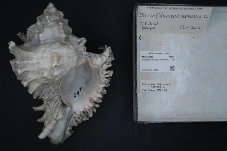 Keywords: Naturalis Biodiversity Center - RMNH.MOL.129091 - Chicoreus ramosus (Linnaeus, 1758) - Muricidae - Mollusc shell.jpeg artwork Dimensions artwork Document type Muricidae subfamily Muricinae Chicoreus Individual count Infraspecific epithet Infraspecific rank Institution Naturalis Kind of unit artwork Kind of unit specimen shell Life stage Medium artwork Nomenclatural code Source institute Leiden Scale the width of the text on the species/QR-code label is 38 mm Occurrence ID page Neogastropoda Other fields Other versions artwork Permission license Naturalis donation CC-0 Mollusca Publication location Scientific name Chicoreus ramosus Linnaeus 1758 Scientific name authorship Linnaeus 1758 Source url http //bioportal naturalis nl Specific epithet ramosus State or province Subject keywords artwork Subject keywords publication Title artwork Title publication Type status Uploaded with GWToolset Naturalis_Biodiversity_Center_-_RMNH MOL 129091_-_Chicoreus_ramosus_ Linnaeus _1758 _-_Muricidae_-_Mollusc_shell http //medialib naturalis nl/file/id/RMNH MOL 129091/format/large Molluscs at Naturalis from the Rijksmuseum van Natuurlijke Historie Media donated by Naturalis Biodiversity Center Chicoreus ramosus |