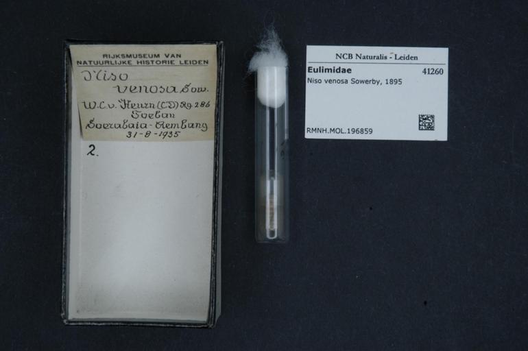 | Keywords: Naturalis Biodiversity Center - RMNH.MOL.196859 - Niso venosa Sowerby, 1895 - Eulimidae - Mollusc shell.jpeg artwork Dimensions artwork Document type Eulimidae Niso Individual count Infraspecific epithet Infraspecific rank Institution Naturalis Kind of unit artwork Kind of unit specimen shell Life stage Medium artwork Nomenclatural code Source institute Rijksmuseum van Natuurlijke Historie Leiden Scale the width of the text on the species/QR-code label is 38 mm Occurrence ID page Other fields Other versions artwork Permission license Naturalis donation CC-0 Mollusca Publication location Scientific name Niso venosa Sowerby 1895 Scientific name authorship Sowerby 1895 Source url http //bioportal naturalis nl Specific epithet venosa State or province Subject keywords artwork Subject keywords publication Title artwork Title publication Type status Uploaded with GWToolset Naturalis_Biodiversity_Center_-_RMNH MOL 196859_-_Niso_venosa_Sowerby _1895_-_Eulimidae_-_Mollusc_shell http //medialib naturalis nl/file/id/RMNH MOL 196859/format/large Media donated by Naturalis Biodiversity Center Molluscs at Naturalis from the Rijksmuseum van Natuurlijke Historie Niso venosa Niso |