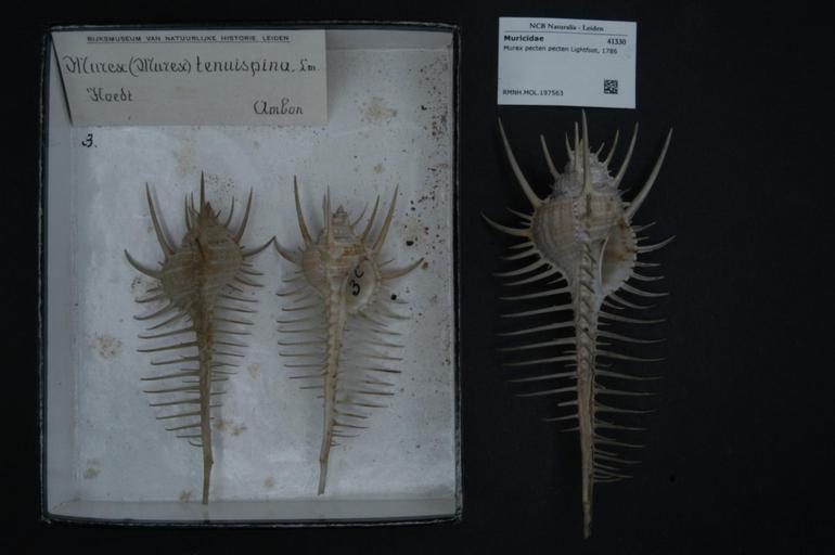 Keywords: Naturalis Biodiversity Center - RMNH.MOL.197563 - Murex pecten pecten Lightfoot, 1786 - Muricidae - Mollusc shell.jpeg artwork Dimensions artwork Document type Muricidae subfamily Muricinae Murex Individual count Infraspecific epithet pecten Infraspecific rank Institution Naturalis Kind of unit artwork Kind of unit specimen shell Life stage Medium artwork Nomenclatural code Source institute Rijksmuseum van Natuurlijke Historie Leiden Scale the width of the text on the species/QR-code label is 38 mm Occurrence ID page Neogastropoda Other fields Other versions artwork Permission license Naturalis donation CC-0 Mollusca Publication location Scientific name Murex pecten pecten Lightfoot 1786 Scientific name authorship Lightfoot 1786 Source url http //bioportal naturalis nl Specific epithet pecten State or province Subject keywords artwork Subject keywords publication Title artwork Title publication Type status Uploaded with GWToolset Naturalis_Biodiversity_Center_-_RMNH MOL 197563_-_Murex_pecten_pecten_Lightfoot _1786_-_Muricidae_-_Mollusc_shell http //medialib naturalis nl/file/id/RMNH MOL 197563/format/large Media donated by Naturalis Biodiversity Center Molluscs at Naturalis from the Rijksmuseum van Natuurlijke Historie Murex pecten |