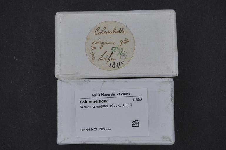 | Keywords: Naturalis Biodiversity Center - RMNH.MOL.204111 1 - Seminella virginea (Gould, 1860) - Columbellidae - Mollusc shell.jpeg artwork Dimensions artwork Document type Columbellidae subfamily Pyreninae Seminella Individual count Infraspecific epithet Infraspecific rank Institution Naturalis Kind of unit artwork Kind of unit specimen shell Life stage Medium artwork Nomenclatural code Source institute Rijksmuseum van Natuurlijke Historie Leiden Scale the width of the text on the species/QR-code label is 38 mm Occurrence ID page Other fields Other versions artwork Permission license Naturalis donation CC-0 Mollusca Publication location Scientific name Seminella virginea Gould 1860 Scientific name authorship Gould 1860 Source url http //bioportal naturalis nl Specific epithet virginea State or province Subject keywords artwork Subject keywords publication Title artwork Title publication Type status Uploaded with GWToolset Naturalis_Biodiversity_Center_-_RMNH MOL 204111_1_-_Seminella_virginea_ Gould _1860 _-_Columbellidae_-_Mollusc_shell http //medialib naturalis nl/file/id/RMNH MOL 204111_1/format/large Media donated by Naturalis Biodiversity Center Molluscs at Naturalis from the Rijksmuseum van Natuurlijke Historie Seminella virginea Seminella |