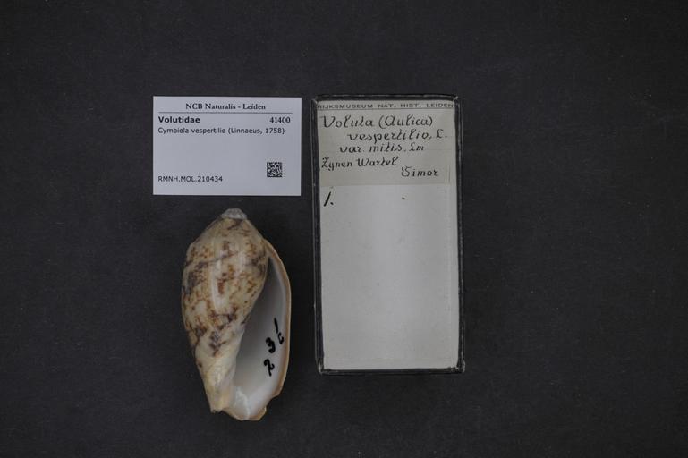 Keywords: Naturalis Biodiversity Center - RMNH.MOL.210434 - Cymbiola vespertilio Linnaeus, 1758 - Volutidae - Mollusc shell.jpeg artwork Dimensions artwork Document type Volutidae Cymbiola Individual count Infraspecific epithet Infraspecific rank Institution Naturalis Kind of unit artwork Kind of unit specimen shell Life stage Medium artwork Nomenclatural code Source institute Rijksmuseum van Natuurlijke Historie Leiden Scale the width of the text on the species/QR-code label is 38 mm Occurrence ID page Neogastropoda Other fields Other versions artwork Permission license Naturalis donation CC-0 Mollusca Publication location Scientific name Cymbiola vespertilio Linnaeus 1758 Scientific name authorship Linnaeus 1758 Source url http //bioportal naturalis nl Specific epithet vespertilio State or province Subject keywords artwork Subject keywords publication Title artwork Title publication Type status Uploaded with GWToolset Naturalis_Biodiversity_Center_-_RMNH MOL 210434_-_Cymbiola_vespertilio_Linnaeus _1758_-_Volutidae_-_Mollusc_shell http //medialib naturalis nl/file/id/RMNH MOL 210434/format/large Media donated by Naturalis Biodiversity Center Molluscs at Naturalis from the Rijksmuseum van Natuurlijke Historie Cymbiola vespertilio Cymbiola |