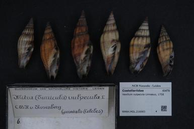Keywords: Naturalis Biodiversity Center - RMNH.MOL.216983 - Vexillum vulpecula (Linnaeus, 1758) - Costellariidae - Mollusc shell.jpeg artwork Dimensions artwork Document type Costellariidae Vexillum Individual count Infraspecific epithet Infraspecific rank Institution Naturalis Kind of unit artwork Kind of unit specimen shell Life stage Medium artwork Nomenclatural code Source institute Rijksmuseum van Natuurlijke Historie Leiden Scale the width of the text on the species/QR-code label is 38 mm Occurrence ID page Neogastropoda Other fields Other versions artwork Permission license Naturalis donation CC-0 Mollusca Publication location Scientific name Vexillum vulpecula Linnaeus 1758 Scientific name authorship Linnaeus 1758 Source url http //bioportal naturalis nl Specific epithet vulpecula State or province Subject keywords artwork Subject keywords publication Title artwork Title publication Type status Uploaded with GWToolset Naturalis_Biodiversity_Center_-_RMNH MOL 216983_-_Vexillum_vulpecula_ Linnaeus _1758 _-_Costellariidae_-_Mollusc_shell http //medialib naturalis nl/file/id/RMNH MOL 216983/format/large Molluscs at Naturalis from the Rijksmuseum van Natuurlijke Historie Media donated by Naturalis Biodiversity Center Vexillum vulpecula Vexillum |