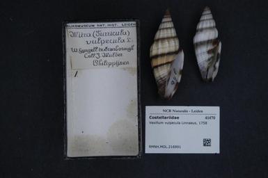 Keywords: Naturalis Biodiversity Center - RMNH.MOL.216991 - Vexillum vulpecula (Linnaeus, 1758) - Costellariidae - Mollusc shell.jpeg artwork Dimensions artwork Document type Costellariidae Vexillum Individual count Infraspecific epithet Infraspecific rank Institution Naturalis Kind of unit artwork Kind of unit specimen shell Life stage Medium artwork Nomenclatural code Source institute Rijksmuseum van Natuurlijke Historie Leiden Scale the width of the text on the species/QR-code label is 38 mm Occurrence ID page Neogastropoda Other fields Other versions artwork Permission license Naturalis donation CC-0 Mollusca Publication location Scientific name Vexillum vulpecula Linnaeus 1758 Scientific name authorship Linnaeus 1758 Source url http //bioportal naturalis nl Specific epithet vulpecula State or province Subject keywords artwork Subject keywords publication Title artwork Title publication Type status Uploaded with GWToolset Naturalis_Biodiversity_Center_-_RMNH MOL 216991_-_Vexillum_vulpecula_ Linnaeus _1758 _-_Costellariidae_-_Mollusc_shell http //medialib naturalis nl/file/id/RMNH MOL 216991/format/large Molluscs at Naturalis from the Rijksmuseum van Natuurlijke Historie Media donated by Naturalis Biodiversity Center Vexillum vulpecula Vexillum |