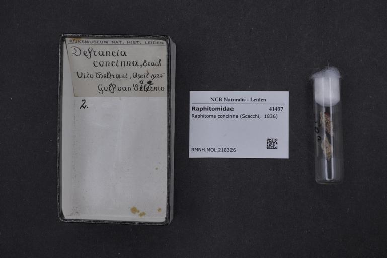 | Keywords: Naturalis Biodiversity Center - RMNH.MOL.218326 - Raphitoma concinna (Scacchi, 1836) - Raphitomidae - Mollusc shell.jpeg artwork Dimensions artwork Document type Raphitomidae Raphitoma Individual count Infraspecific epithet Infraspecific rank Institution Naturalis Kind of unit artwork Kind of unit specimen shell Life stage Medium artwork Nomenclatural code Source institute Rijksmuseum van Natuurlijke Historie Leiden Scale the width of the text on the species/QR-code label is 38 mm Occurrence ID page Other fields Other versions artwork Permission license Naturalis donation CC-0 Mollusca Publication location Scientific name Raphitoma concinna Scacchi 1836 Scientific name authorship Scacchi 1836 Source url http //bioportal naturalis nl Specific epithet concinna State or province Subject keywords artwork Subject keywords publication Title artwork Title publication Type status Uploaded with GWToolset Naturalis_Biodiversity_Center_-_RMNH MOL 218326_-_Raphitoma_concinna_ Scacchi __1836 _-_Raphitomidae_-_Mollusc_shell http //medialib naturalis nl/file/id/RMNH MOL 218326/format/large Molluscs at Naturalis from the Rijksmuseum van Natuurlijke Historie Media donated by Naturalis Biodiversity Center Raphitoma concinna Raphitoma |