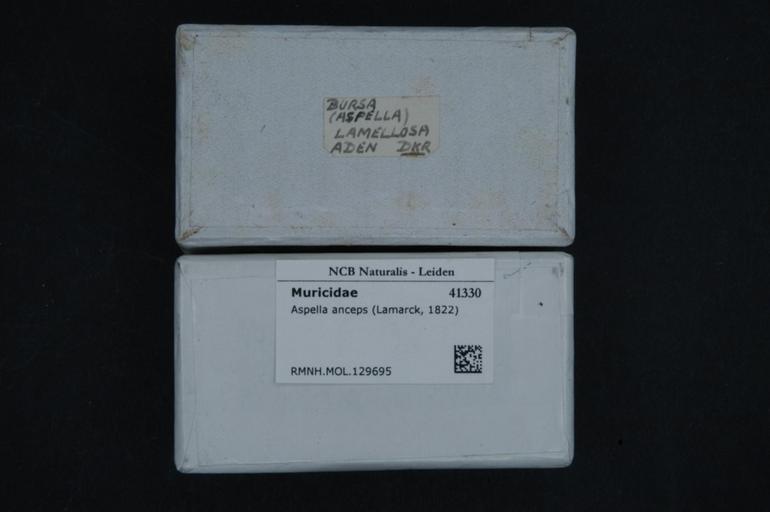 | Keywords: Naturalis Biodiversity Center - RMNH.MOL.129695 1 - Aspella anceps (Lamarck, 1822) - Muricidae - Mollusc shell.jpeg artwork Dimensions artwork Document type Muricidae subfamily Muricinae Aspella Individual count Infraspecific epithet Infraspecific rank Institution Naturalis Kind of unit artwork Kind of unit specimen shell Life stage Medium artwork Nomenclatural code Source institute Leiden Scale the width of the text on the species/QR-code label is 38 mm Occurrence ID page Neogastropoda Other fields Other versions artwork Permission license Naturalis donation CC-0 Mollusca Publication location Scientific name Aspella anceps Lamarck 1822 Scientific name authorship Lamarck 1822 Source url http //bioportal naturalis nl Specific epithet anceps State or province Subject keywords artwork Subject keywords publication Title artwork Title publication Type status Uploaded with GWToolset Naturalis_Biodiversity_Center_-_RMNH MOL 129695_1_-_Aspella_anceps_ Lamarck _1822 _-_Muricidae_-_Mollusc_shell http //medialib naturalis nl/file/id/RMNH MOL 129695_1/format/large Molluscs at Naturalis from the Rijksmuseum van Natuurlijke Historie Media donated by Naturalis Biodiversity Center Aspella Aspella anceps |