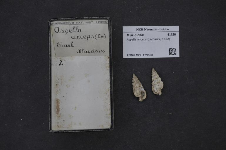 | Keywords: Naturalis Biodiversity Center - RMNH.MOL.129698 - Aspella anceps (Lamarck, 1822) - Muricidae - Mollusc shell.jpeg artwork Dimensions artwork Document type Muricidae subfamily Muricinae Aspella Individual count Infraspecific epithet Infraspecific rank Institution Naturalis Kind of unit artwork Kind of unit specimen shell Life stage Medium artwork Nomenclatural code Source institute Leiden Scale the width of the text on the species/QR-code label is 38 mm Occurrence ID page Neogastropoda Other fields Other versions artwork Permission license Naturalis donation CC-0 Mollusca Publication location Scientific name Aspella anceps Lamarck 1822 Scientific name authorship Lamarck 1822 Source url http //bioportal naturalis nl Specific epithet anceps State or province Subject keywords artwork Subject keywords publication Title artwork Title publication Type status Uploaded with GWToolset Naturalis_Biodiversity_Center_-_RMNH MOL 129698_-_Aspella_anceps_ Lamarck _1822 _-_Muricidae_-_Mollusc_shell http //medialib naturalis nl/file/id/RMNH MOL 129698/format/large Molluscs at Naturalis from the Rijksmuseum van Natuurlijke Historie Media donated by Naturalis Biodiversity Center Aspella Aspella anceps |