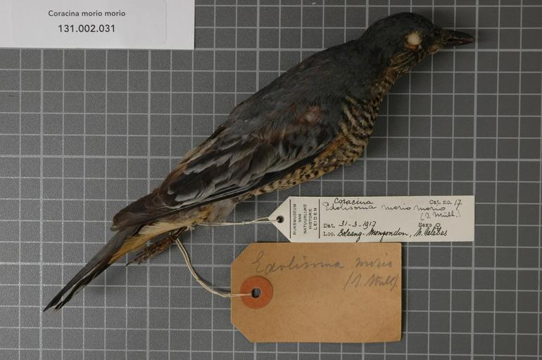 | Keywords: Naturalis Biodiversity Center - RMNH.AVES.123721 1 - Coracina morio morio (Muller, 1843) - Campephagidae - bird skin specimen.jpeg artwork Dimensions artwork Document type Campephagidae Coracina Individual count 1 Infraspecific epithet morio Infraspecific rank Institution Naturalis Kind of unit artwork Kind of unit specimen skin Life stage Indonesia N Celebes Bolaäng-Mongondow Goeroepahi Medium artwork Nomenclatural code Locality remark Bolaang-Mongondow Goeroepaln Occurrence ID page Other fields Other versions artwork Permission license Naturalis donation CC-0 Publication location Scientific name Coracina morio morio Muller 1843 Scientific name authorship Muller 1843 female Source url http //bioportal naturalis nl Specific epithet morio State or province N Celebes Bolaäng-Mongondow Subject keywords artwork Subject keywords publication Title artwork Title publication Type status Uploaded with GWToolset Naturalis_Biodiversity_Center_-_RMNH AVES 123721_1_-_Coracina_morio_morio_ Muller _1843 _-_Campephagidae_-_bird_skin_specimen http //medialib naturalis nl/file/id/RMNH AVES 123721_1/format/large Media donated by Naturalis Biodiversity Center Songbird specimens at Naturalis Biodiversity Center Coracina morio morio |