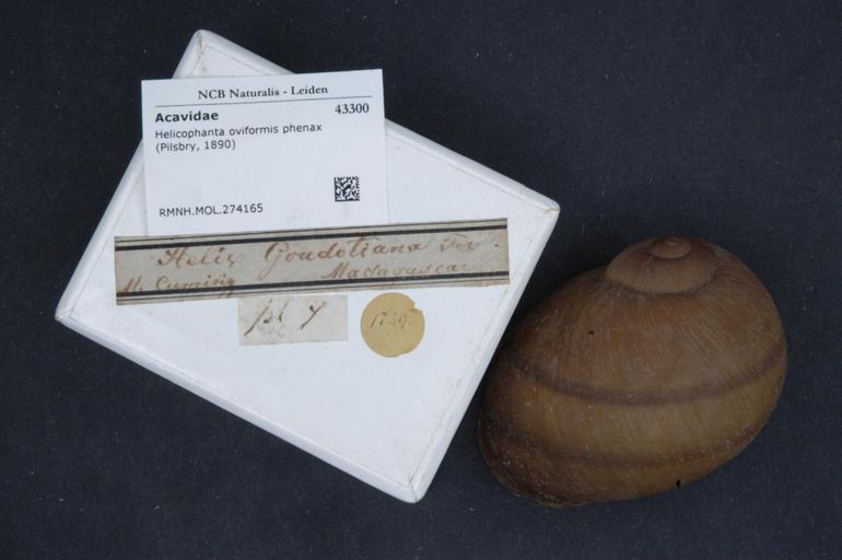 Keywords: Naturalis Biodiversity Center - RMNH.MOL.274165 1 - Helicophanta oviformis phenax (Pilsbry, 1890) - Acavidae - Mollusc shell.jpeg artwork Dimensions artwork Document type Acavidae subfamily Acavinae Helicophanta Individual count Infraspecific epithet phenax Infraspecific rank Institution Naturalis Kind of unit artwork Kind of unit specimen shell Life stage Medium artwork Nomenclatural code Source institute Rijksmuseum van Natuurlijke Historie Leiden Scale the width of the text on the species/QR-code label is 38 mm Occurrence ID page Other fields Other versions artwork Permission license Naturalis donation CC-0 Mollusca Publication location Scientific name Helicophanta oviformis phenax Pilsbry 1890 Scientific name authorship Pilsbry 1890 Source url http //bioportal naturalis nl Specific epithet oviformis State or province Subject keywords artwork Subject keywords publication Title artwork Title publication Type status Uploaded with GWToolset Naturalis_Biodiversity_Center_-_RMNH MOL 274165_1_-_Helicophanta_oviformis_phenax_ Pilsbry _1890 _-_Acavidae_-_Mollusc_shell http //medialib naturalis nl/file/id/RMNH MOL 274165_1/format/large Molluscs at Naturalis from the Rijksmuseum van Natuurlijke Historie Media donated by Naturalis Biodiversity Center Helicophanta oviformis Helicophanta |