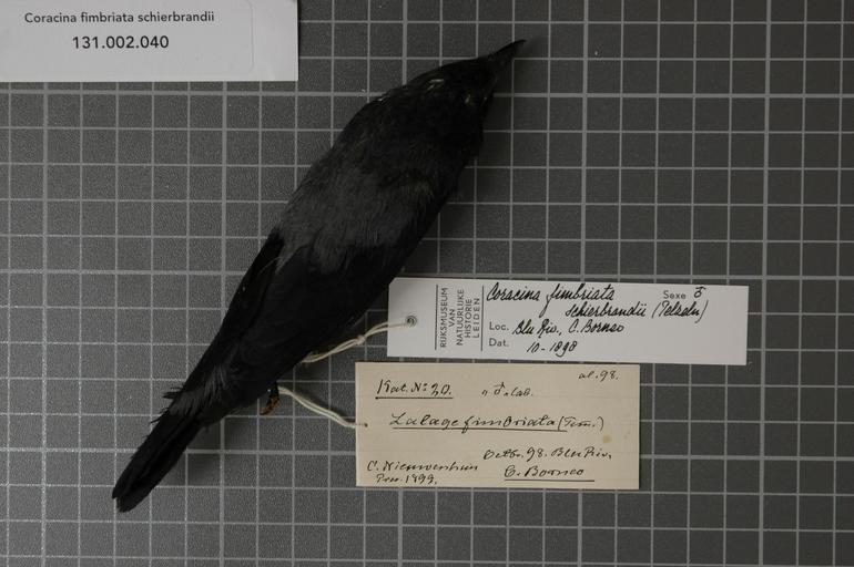 | Keywords: Naturalis Biodiversity Center - RMNH.AVES.123810 1 - Coracina fimbriata schierbrandii (Pelzeln, 1865) - Campephagidae - bird skin specimen.jpeg artwork Dimensions artwork Document type Campephagidae Coracina Individual count 1 Infraspecific epithet schierbrandii Infraspecific rank Institution Naturalis Kind of unit artwork Kind of unit specimen skin Life stage Indonesia C Borneo Blu riv Medium artwork Nomenclatural code Sex remark male lab Occurrence ID page Other fields Other versions artwork Permission license Naturalis donation CC-0 Publication location Scientific name Coracina fimbriata schierbrandii Pelzeln 1865 Scientific name authorship Pelzeln 1865 male Source url http //bioportal naturalis nl Specific epithet fimbriata State or province C Borneo Subject keywords artwork Subject keywords publication Title artwork Title publication Type status Uploaded with GWToolset Naturalis_Biodiversity_Center_-_RMNH AVES 123810_1_-_Coracina_fimbriata_schierbrandii_ Pelzeln _1865 _-_Campephagidae_-_bird_skin_specimen http //medialib naturalis nl/file/id/RMNH AVES 123810_1/format/large Media donated by Naturalis Biodiversity Center Songbird specimens at Naturalis Biodiversity Center Coracina fimbriata schierbrandii |