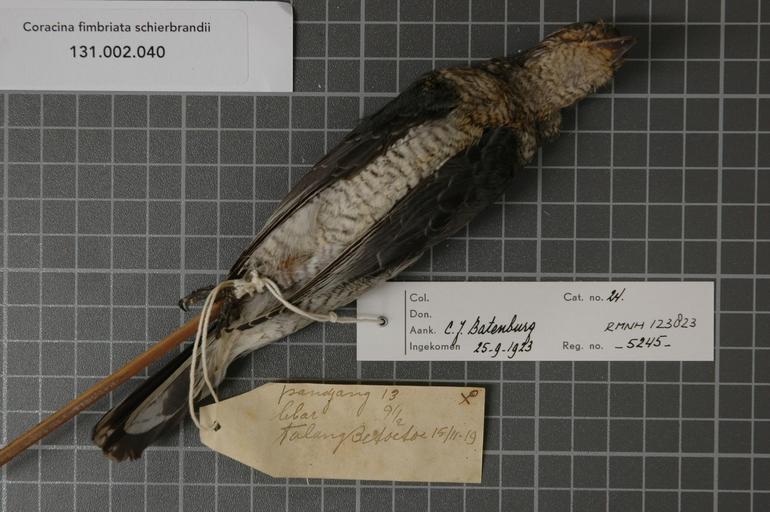 | Keywords: Naturalis Biodiversity Center - RMNH.AVES.123823 2 - Coracina fimbriata schierbrandii (Pelzeln, 1865) - Campephagidae - bird skin specimen.jpeg artwork Dimensions artwork Document type Campephagidae Coracina Individual count 1 Infraspecific epithet schierbrandii Infraspecific rank Institution Naturalis Kind of unit artwork Kind of unit specimen skin Life stage Indonesia Sumatra Res Palembang Medium artwork Nomenclatural code Additional info Talang Betoetoe Occurrence ID page Other fields Other versions artwork Permission license Naturalis donation CC-0 Publication location Scientific name Coracina fimbriata schierbrandii Pelzeln 1865 Scientific name authorship Pelzeln 1865 female Source url http //bioportal naturalis nl Specific epithet fimbriata State or province Sumatra Res Palembang Subject keywords artwork Subject keywords publication Title artwork Title publication Type status Uploaded with GWToolset Naturalis_Biodiversity_Center_-_RMNH AVES 123823_2_-_Coracina_fimbriata_schierbrandii_ Pelzeln _1865 _-_Campephagidae_-_bird_skin_specimen http //medialib naturalis nl/file/id/RMNH AVES 123823_2/format/large Media donated by Naturalis Biodiversity Center Songbird specimens at Naturalis Biodiversity Center Coracina fimbriata schierbrandii |