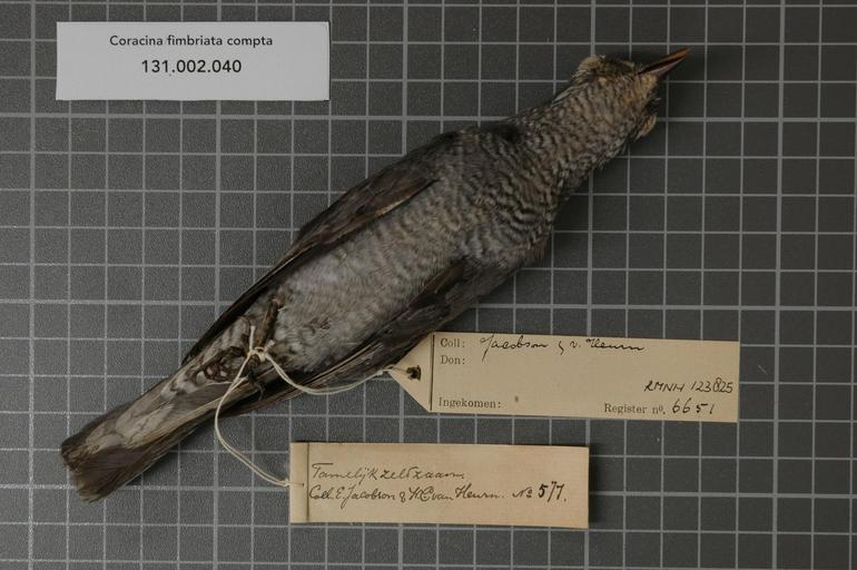 | Keywords: Naturalis Biodiversity Center - RMNH.AVES.123825 2 - Coracina fimbriata compta (Richmond, 1903) - Campephagidae - bird skin specimen.jpeg artwork Dimensions artwork Document type Campephagidae Coracina Individual count 1 Infraspecific epithet compta Infraspecific rank Institution Naturalis Kind of unit artwork Kind of unit specimen skin Life stage Simalur Sinabang Medium artwork Nomenclatural code Age remark geslachtsrijp Occurrence ID page Other fields Other versions artwork Permission license Naturalis donation CC-0 Publication location Scientific name Coracina fimbriata compta Richmond 1903 Scientific name authorship Richmond 1903 female Source url http //bioportal naturalis nl Specific epithet fimbriata State or province Simalur Subject keywords artwork Subject keywords publication Title artwork Title publication Type status Uploaded with GWToolset Naturalis_Biodiversity_Center_-_RMNH AVES 123825_2_-_Coracina_fimbriata_compta_ Richmond _1903 _-_Campephagidae_-_bird_skin_specimen http //medialib naturalis nl/file/id/RMNH AVES 123825_2/format/large Media donated by Naturalis Biodiversity Center Songbird specimens at Naturalis Biodiversity Center Coracina fimbriata compta |