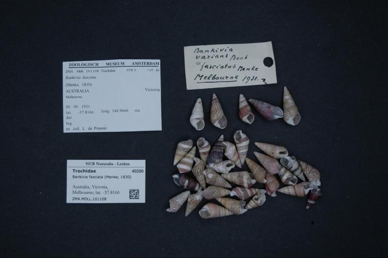 | Keywords: Naturalis Biodiversity Center - ZMA.MOLL.101108 - Bankivia fasciata (Menke, 1830) - Trochidae - Mollusc shell.jpeg artwork Dimensions artwork Document type Trochidae Bankivia Individual count Infraspecific epithet Infraspecific rank Institution Naturalis Kind of unit artwork Kind of unit specimen shell Life stage Australia Victoria Melbourne; lat -37 8166 lon 144 9666; 1931 Medium artwork Nomenclatural code Moll Scale the width of the text on the species/QR-code label is 38 mm Occurrence ID page Other fields Other versions artwork Permission license Naturalis donation CC-0 Publication location Scientific name Bankivia fasciata Menke 1830 Scientific name authorship Source url http //bioportal naturalis nl Specific epithet fasciata State or province Victoria Subject keywords artwork Subject keywords publication Title artwork Title publication Type status Uploaded with GWToolset Naturalis_Biodiversity_Center_-_ZMA MOLL 101108_-_Bankivia_fasciata_ Menke _1830 _-_Trochidae_-_Mollusc_shell http //medialib naturalis nl/file/id/ZMA MOLL 101108/format/large Media donated by Naturalis Biodiversity Center Molluscs at Naturalis from the Zoölogisch Museum Amsterdam Bankivia fasciata |