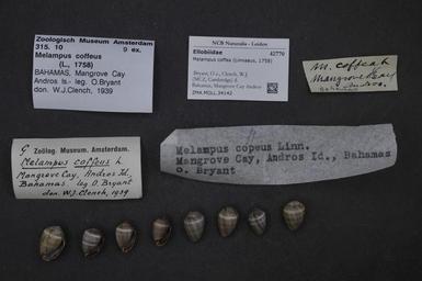 Keywords: Naturalis Biodiversity Center - ZMA.MOLL.34142 - Melampus coffea (Linnaeus, 1758) - Ellobiidae - Mollusc shell.jpeg artwork Dimensions artwork Document type Ellobiidae subfamily Melampodinae Melampus Individual count Infraspecific epithet Infraspecific rank Institution Naturalis Kind of unit artwork Kind of unit specimen shell Life stage Bahamas Mangrove Cay Andros Is Medium artwork Nomenclatural code Source institute Zoölogisch Museum Amsterdam Scale the width of the text on the species/QR-code label is 38 mm Occurrence ID page Other fields Other versions artwork Permission license Naturalis donation CC-0 Mollusca Publication location Scientific name Melampus coffea Linnaeus 1758 Scientific name authorship Linnaeus 1758 Source url http //bioportal naturalis nl Specific epithet coffea State or province Andros Island Subject keywords artwork Subject keywords publication Title artwork Title publication Type status Uploaded with GWToolset Naturalis_Biodiversity_Center_-_ZMA MOLL 34142_-_Melampus_coffea_ Linnaeus _1758 _-_Ellobiidae_-_Mollusc_shell http //medialib naturalis nl/file/id/ZMA MOLL 34142/format/large Media donated by Naturalis Biodiversity Center Molluscs at Naturalis from the Zoölogisch Museum Amsterdam Melampus coffea Melampus |