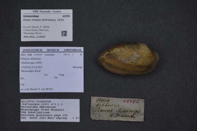 | Keywords: Naturalis Biodiversity Center - ZMA.MOLL.210065 - Elliptio dilatata (Rafinesque, 1820) - Unionidae - Mollusc shell.jpeg artwork Dimensions artwork Document type Unionidae subfamily Ambleminae Elliptio Individual count Infraspecific epithet Infraspecific rank Institution Naturalis Kind of unit artwork Kind of unit specimen shell Life stage United States Missouri Mississippi River Medium artwork Nomenclatural code Scale the width of the text on the species/QR-code label is 38 mm Occurrence ID page Other fields Other versions artwork Permission license Naturalis donation CC-0 Mollusca Publication location Scientific name Elliptio dilatata Rafinesque 1820 Scientific name authorship Rafinesque 1820 Source url http //bioportal naturalis nl Specific epithet dilatata State or province Missouri Subject keywords artwork Subject keywords publication Title artwork Title publication Type status Uploaded with GWToolset Naturalis_Biodiversity_Center_-_ZMA MOLL 210065_-_Elliptio_dilatata_ Rafinesque _1820 _-_Unionidae_-_Mollusc_shell http //medialib naturalis nl/file/id/ZMA MOLL 210065/format/large Media donated by Naturalis Biodiversity Center Molluscs at Naturalis from the Zoölogisch Museum Amsterdam Elliptio dilatata Elliptio |