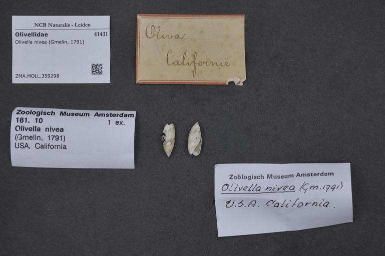 | Keywords: Naturalis Biodiversity Center - ZMA.MOLL.359298 - Olivella nivea (Gmelin, 1791) - Olivellidae - Mollusc shell.jpeg artwork Dimensions artwork Document type Olivellidae Olivella Individual count Infraspecific epithet Infraspecific rank Institution Naturalis Kind of unit artwork Kind of unit specimen shell Life stage Medium artwork Nomenclatural code Source institute Zoölogisch Museum Amsterdam Scale the width of the text on the species/QR-code label is 38 mm Occurrence ID page Other fields Other versions artwork Permission license Naturalis donation CC-0 Mollusca Publication location Scientific name Olivella nivea Gmelin 1791 Scientific name authorship Gmelin 1791 Source url http //bioportal naturalis nl Specific epithet nivea State or province Subject keywords artwork Subject keywords publication Title artwork Title publication Type status Uploaded with GWToolset Naturalis_Biodiversity_Center_-_ZMA MOLL 359298_-_Olivella_nivea_ Gmelin _1791 _-_Olivellidae_-_Mollusc_shell http //medialib naturalis nl/file/id/ZMA MOLL 359298/format/large Media donated by Naturalis Biodiversity Center Molluscs at Naturalis from the Zoölogisch Museum Amsterdam Olivella nivea Olivella |