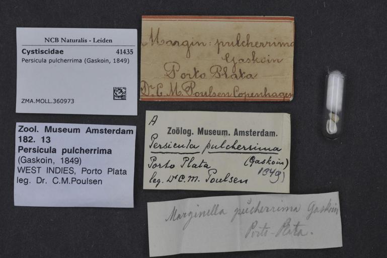| Keywords: Naturalis Biodiversity Center - ZMA.MOLL.360973 - Persicula pulcherrima (Gaskoin, 1849) - Cystiscidae - Mollusc shell.jpeg artwork Dimensions artwork Document type Cystiscidae subfamily Persiculinae Persicula Individual count Infraspecific epithet Infraspecific rank Institution Naturalis Kind of unit artwork Kind of unit specimen shell Life stage Medium artwork Nomenclatural code Source institute Zoölogisch Museum Amsterdam Scale the width of the text on the species/QR-code label is 38 mm Occurrence ID page Neogastropoda Other fields Other versions artwork Permission license Naturalis donation CC-0 Mollusca Publication location Scientific name Persicula pulcherrima Gaskoin 1849 Scientific name authorship Gaskoin 1849 Source url http //bioportal naturalis nl Specific epithet pulcherrima State or province Subject keywords artwork Subject keywords publication Title artwork Title publication Type status Uploaded with GWToolset Naturalis_Biodiversity_Center_-_ZMA MOLL 360973_-_Persicula_pulcherrima_ Gaskoin _1849 _-_Cystiscidae_-_Mollusc_shell http //medialib naturalis nl/file/id/ZMA MOLL 360973/format/large Media donated by Naturalis Biodiversity Center Molluscs at Naturalis from the Zoölogisch Museum Amsterdam Persicula pulcherrima Persicula |