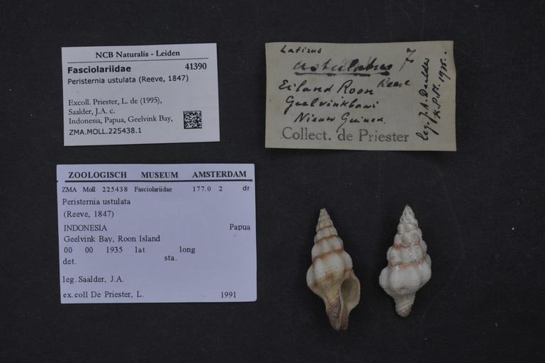 Keywords: Naturalis Biodiversity Center - ZMA.MOLL.225438.1 - Peristernia ustulata (Reeve, 1847) - Fasciolariidae - Mollusc shell.jpeg artwork Dimensions artwork Document type Fasciolariidae subfamily Peristerniinae Peristernia Individual count Infraspecific epithet Infraspecific rank Institution Naturalis Kind of unit artwork Kind of unit specimen shell Life stage Indonesia Papua Geelvink Bay Roon Island; 1935 Medium artwork Nomenclatural code Moll Scale the width of the text on the species/QR-code label is 38 mm Occurrence ID page Other fields Other versions artwork Permission license Naturalis donation CC-0 Mollusca Publication location Scientific name Peristernia ustulata Reeve 1847 Scientific name authorship Reeve 1847 Source url http //bioportal naturalis nl Specific epithet ustulata State or province Papua Subject keywords artwork Subject keywords publication Title artwork Title publication Type status Uploaded with GWToolset Naturalis_Biodiversity_Center_-_ZMA MOLL 225438 1_-_Peristernia_ustulata_ Reeve _1847 _-_Fasciolariidae_-_Mollusc_shell http //medialib naturalis nl/file/id/ZMA MOLL 225438 1/format/large Media donated by Naturalis Biodiversity Center Molluscs at Naturalis from the Zoölogisch Museum Amsterdam Peristernia ustulata Peristernia