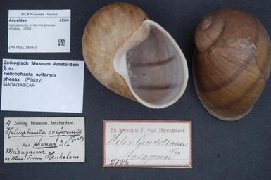 Keywords: Naturalis Biodiversity Center - ZMA.MOLL.388983 - Helicophanta oviformis phenax (Pilsbry, 1890) - Acavidae - Mollusc shell.jpeg artwork Dimensions artwork Document type Acavidae subfamily Acavinae Helicophanta Individual count Infraspecific epithet phenax Infraspecific rank Institution Naturalis Kind of unit artwork Kind of unit specimen shell Life stage Medium artwork Nomenclatural code Source institute Rijksmuseum van Natuurlijke Historie Leiden Scale the width of the text on the species/QR-code label is 38 mm Occurrence ID page Other fields Other versions artwork Permission license Naturalis donation CC-0 Mollusca Publication location Scientific name Helicophanta oviformis phenax Pilsbry 1890 Scientific name authorship Pilsbry 1890 Source url http //bioportal naturalis nl Specific epithet oviformis State or province Subject keywords artwork Subject keywords publication Title artwork Title publication Type status Uploaded with GWToolset Naturalis_Biodiversity_Center_-_ZMA MOLL 388983_-_Helicophanta_oviformis_phenax_ Pilsbry _1890 _-_Acavidae_-_Mollusc_shell http //medialib naturalis nl/file/id/ZMA MOLL 388983/format/large Molluscs at Naturalis from the Zoölogisch Museum Amsterdam Media donated by Naturalis Biodiversity Center Helicophanta oviformis Helicophanta