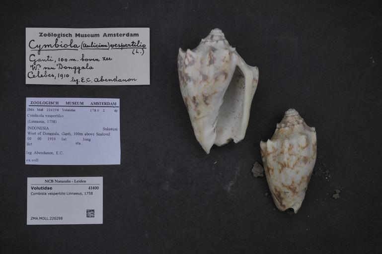 Keywords: Naturalis Biodiversity Center - ZMA.MOLL.226298 - Cymbiola vespertilio Linnaeus, 1758 - Volutidae - Mollusc shell.jpeg artwork Dimensions artwork Document type Volutidae Cymbiola Individual count Infraspecific epithet Infraspecific rank Institution Naturalis Kind of unit artwork Kind of unit specimen shell Life stage Medium artwork Nomenclatural code Scale the width of the text on the species/QR-code label is 38 mm Occurrence ID page Neogastropoda Other fields Other versions artwork Permission license Naturalis donation CC-0 Mollusca Publication location Scientific name Cymbiola vespertilio Linnaeus 1758 Scientific name authorship Linnaeus 1758 Source url http //bioportal naturalis nl Specific epithet vespertilio State or province Subject keywords artwork Subject keywords publication Title artwork Title publication Type status Uploaded with GWToolset Naturalis_Biodiversity_Center_-_ZMA MOLL 226298_-_Cymbiola_vespertilio_Linnaeus _1758_-_Volutidae_-_Mollusc_shell http //medialib naturalis nl/file/id/ZMA MOLL 226298/format/large Media donated by Naturalis Biodiversity Center Molluscs at Naturalis from the Zoölogisch Museum Amsterdam Cymbiola vespertilio Cymbiola |