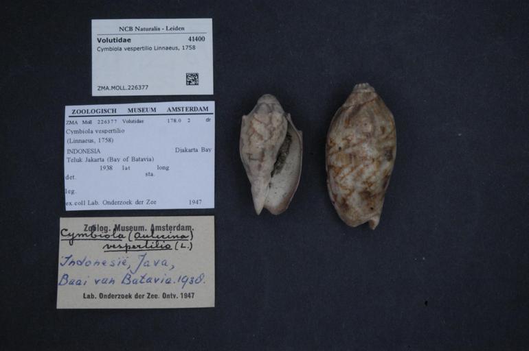 Keywords: Naturalis Biodiversity Center - ZMA.MOLL.226377 - Cymbiola vespertilio Linnaeus, 1758 - Volutidae - Mollusc shell.jpeg artwork Dimensions artwork Document type Volutidae Cymbiola Individual count Infraspecific epithet Infraspecific rank Institution Naturalis Kind of unit artwork Kind of unit specimen shell Life stage Medium artwork Nomenclatural code Scale the width of the text on the species/QR-code label is 38 mm Occurrence ID page Neogastropoda Other fields Other versions artwork Permission license Naturalis donation CC-0 Mollusca Publication location Scientific name Cymbiola vespertilio Linnaeus 1758 Scientific name authorship Linnaeus 1758 Source url http //bioportal naturalis nl Specific epithet vespertilio State or province Subject keywords artwork Subject keywords publication Title artwork Title publication Type status Uploaded with GWToolset Naturalis_Biodiversity_Center_-_ZMA MOLL 226377_-_Cymbiola_vespertilio_Linnaeus _1758_-_Volutidae_-_Mollusc_shell http //medialib naturalis nl/file/id/ZMA MOLL 226377/format/large Media donated by Naturalis Biodiversity Center Molluscs at Naturalis from the Zoölogisch Museum Amsterdam Cymbiola vespertilio Cymbiola |