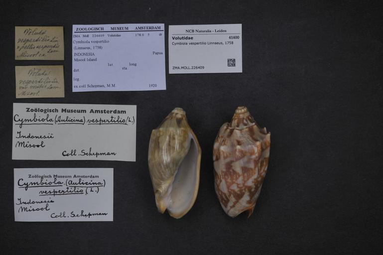 Keywords: Naturalis Biodiversity Center - ZMA.MOLL.226409 - Cymbiola vespertilio Linnaeus, 1758 - Volutidae - Mollusc shell.jpeg artwork Dimensions artwork Document type Volutidae Cymbiola Individual count Infraspecific epithet Infraspecific rank Institution Naturalis Kind of unit artwork Kind of unit specimen shell Life stage Medium artwork Nomenclatural code Scale the width of the text on the species/QR-code label is 38 mm Occurrence ID page Neogastropoda Other fields Other versions artwork Permission license Naturalis donation CC-0 Mollusca Publication location Scientific name Cymbiola vespertilio Linnaeus 1758 Scientific name authorship Linnaeus 1758 Source url http //bioportal naturalis nl Specific epithet vespertilio State or province Subject keywords artwork Subject keywords publication Title artwork Title publication Type status Uploaded with GWToolset Naturalis_Biodiversity_Center_-_ZMA MOLL 226409_-_Cymbiola_vespertilio_Linnaeus _1758_-_Volutidae_-_Mollusc_shell http //medialib naturalis nl/file/id/ZMA MOLL 226409/format/large Media donated by Naturalis Biodiversity Center Molluscs at Naturalis from the Zoölogisch Museum Amsterdam Cymbiola vespertilio Cymbiola |