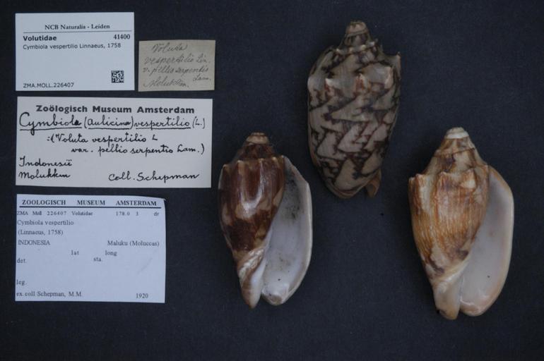 Keywords: Naturalis Biodiversity Center - ZMA.MOLL.226407 - Cymbiola vespertilio Linnaeus, 1758 - Volutidae - Mollusc shell.jpeg artwork Dimensions artwork Document type Volutidae Cymbiola Individual count Infraspecific epithet Infraspecific rank Institution Naturalis Kind of unit artwork Kind of unit specimen shell Life stage Medium artwork Nomenclatural code Scale the width of the text on the species/QR-code label is 38 mm Occurrence ID page Neogastropoda Other fields Other versions artwork Permission license Naturalis donation CC-0 Mollusca Publication location Scientific name Cymbiola vespertilio Linnaeus 1758 Scientific name authorship Linnaeus 1758 Source url http //bioportal naturalis nl Specific epithet vespertilio State or province Subject keywords artwork Subject keywords publication Title artwork Title publication Type status Uploaded with GWToolset Naturalis_Biodiversity_Center_-_ZMA MOLL 226407_-_Cymbiola_vespertilio_Linnaeus _1758_-_Volutidae_-_Mollusc_shell http //medialib naturalis nl/file/id/ZMA MOLL 226407/format/large Media donated by Naturalis Biodiversity Center Molluscs at Naturalis from the Zoölogisch Museum Amsterdam Cymbiola vespertilio Cymbiola |