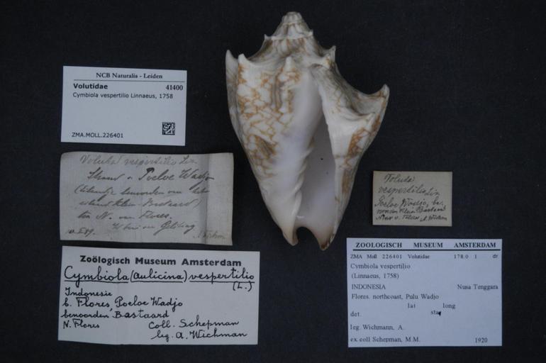 Keywords: Naturalis Biodiversity Center - ZMA.MOLL.226401 - Cymbiola vespertilio Linnaeus, 1758 - Volutidae - Mollusc shell.jpeg artwork Dimensions artwork Document type Volutidae Cymbiola Individual count Infraspecific epithet Infraspecific rank Institution Naturalis Kind of unit artwork Kind of unit specimen shell Life stage Medium artwork Nomenclatural code Scale the width of the text on the species/QR-code label is 38 mm Occurrence ID page Neogastropoda Other fields Other versions artwork Permission license Naturalis donation CC-0 Mollusca Publication location Scientific name Cymbiola vespertilio Linnaeus 1758 Scientific name authorship Linnaeus 1758 Source url http //bioportal naturalis nl Specific epithet vespertilio State or province Subject keywords artwork Subject keywords publication Title artwork Title publication Type status Uploaded with GWToolset Naturalis_Biodiversity_Center_-_ZMA MOLL 226401_-_Cymbiola_vespertilio_Linnaeus _1758_-_Volutidae_-_Mollusc_shell http //medialib naturalis nl/file/id/ZMA MOLL 226401/format/large Media donated by Naturalis Biodiversity Center Molluscs at Naturalis from the Zoölogisch Museum Amsterdam Cymbiola vespertilio Cymbiola |
